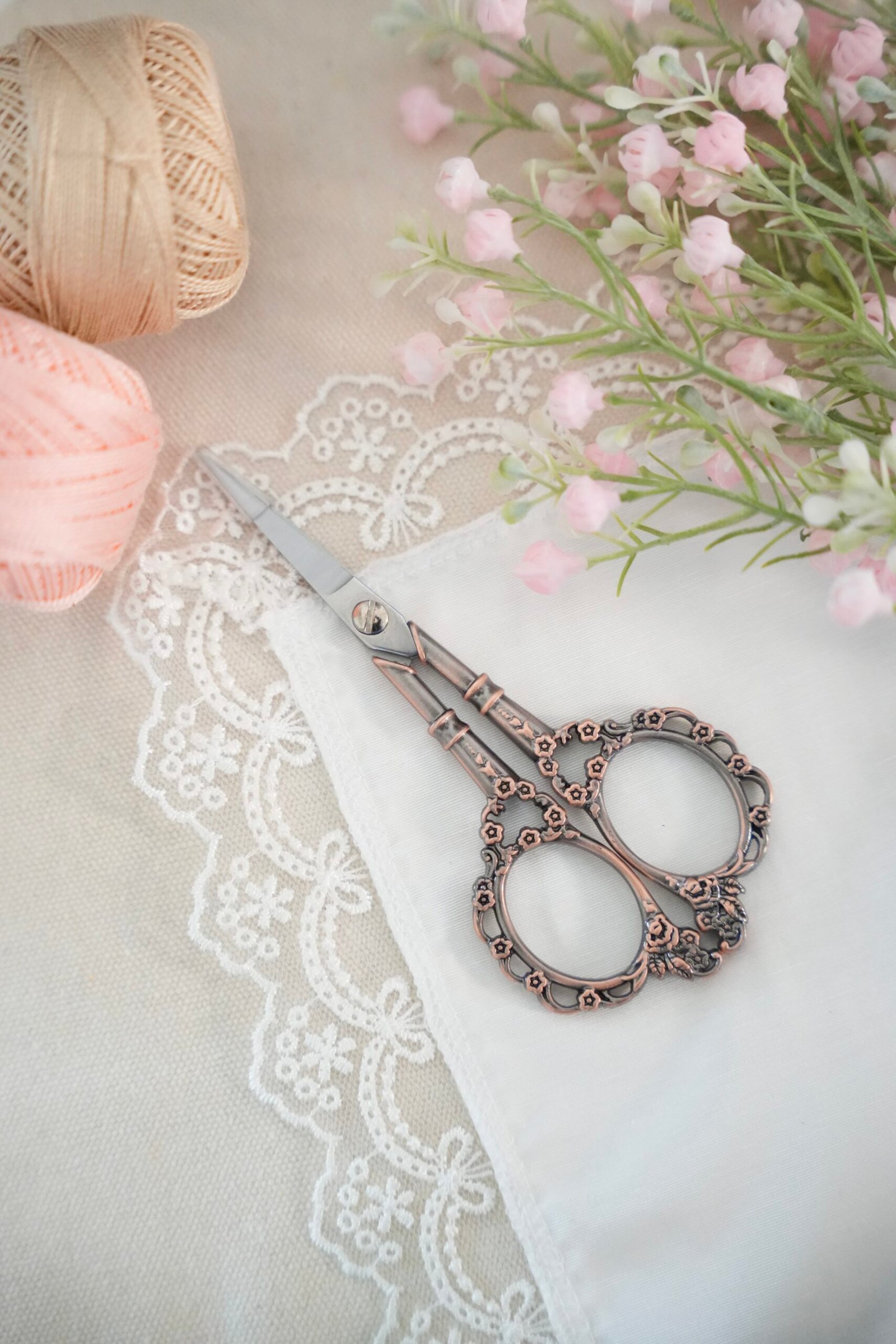 Small, sharp embroidery scissors with a charming vintage design for precise thread cutting.