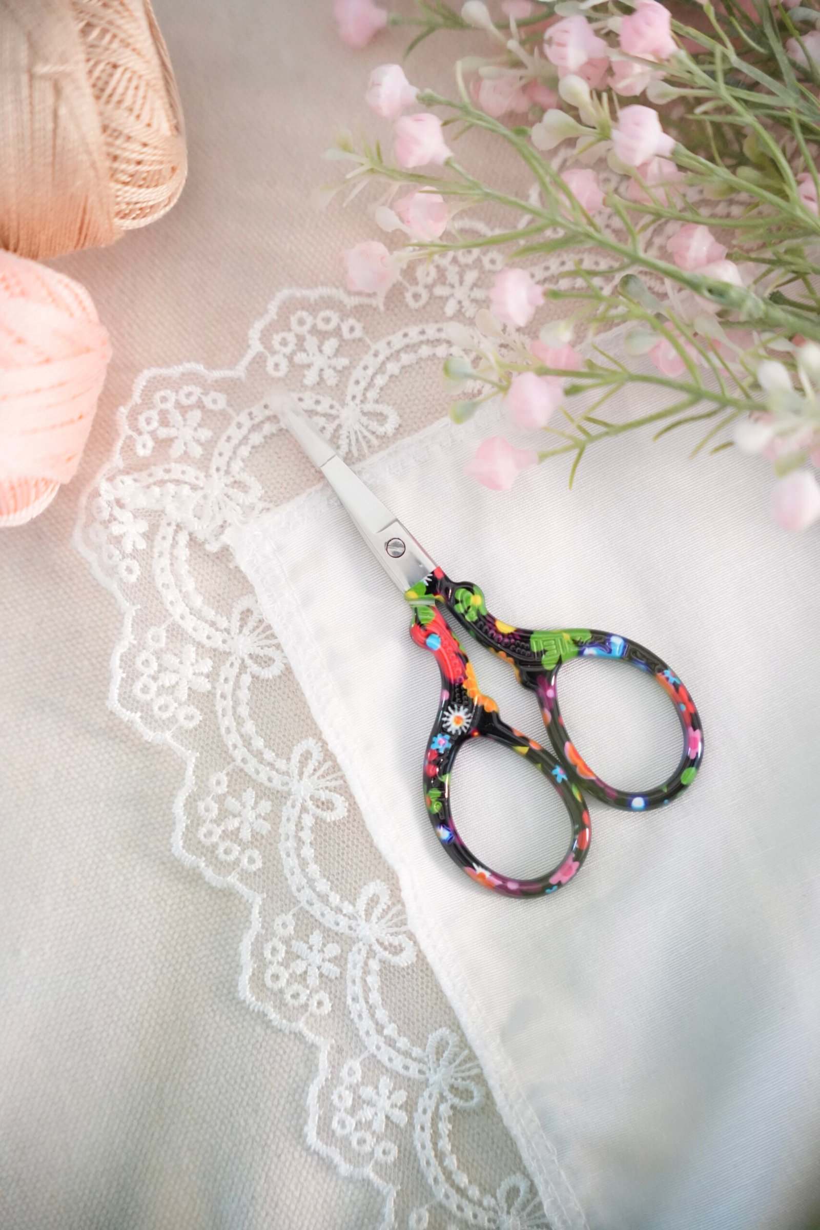 Small, sharp embroidery scissors with a charming vintage design for precise thread cutting.