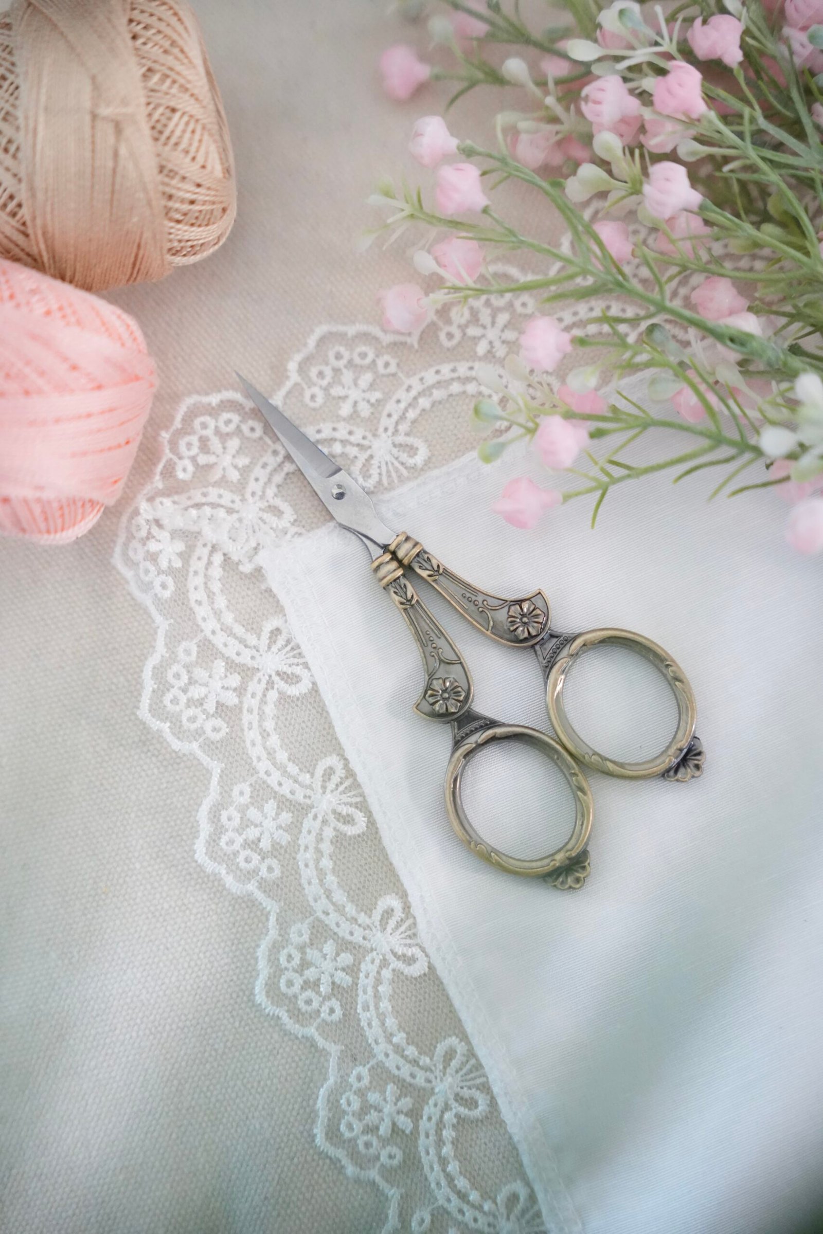 Small, sharp embroidery scissors with a charming vintage design for precise thread cutting.